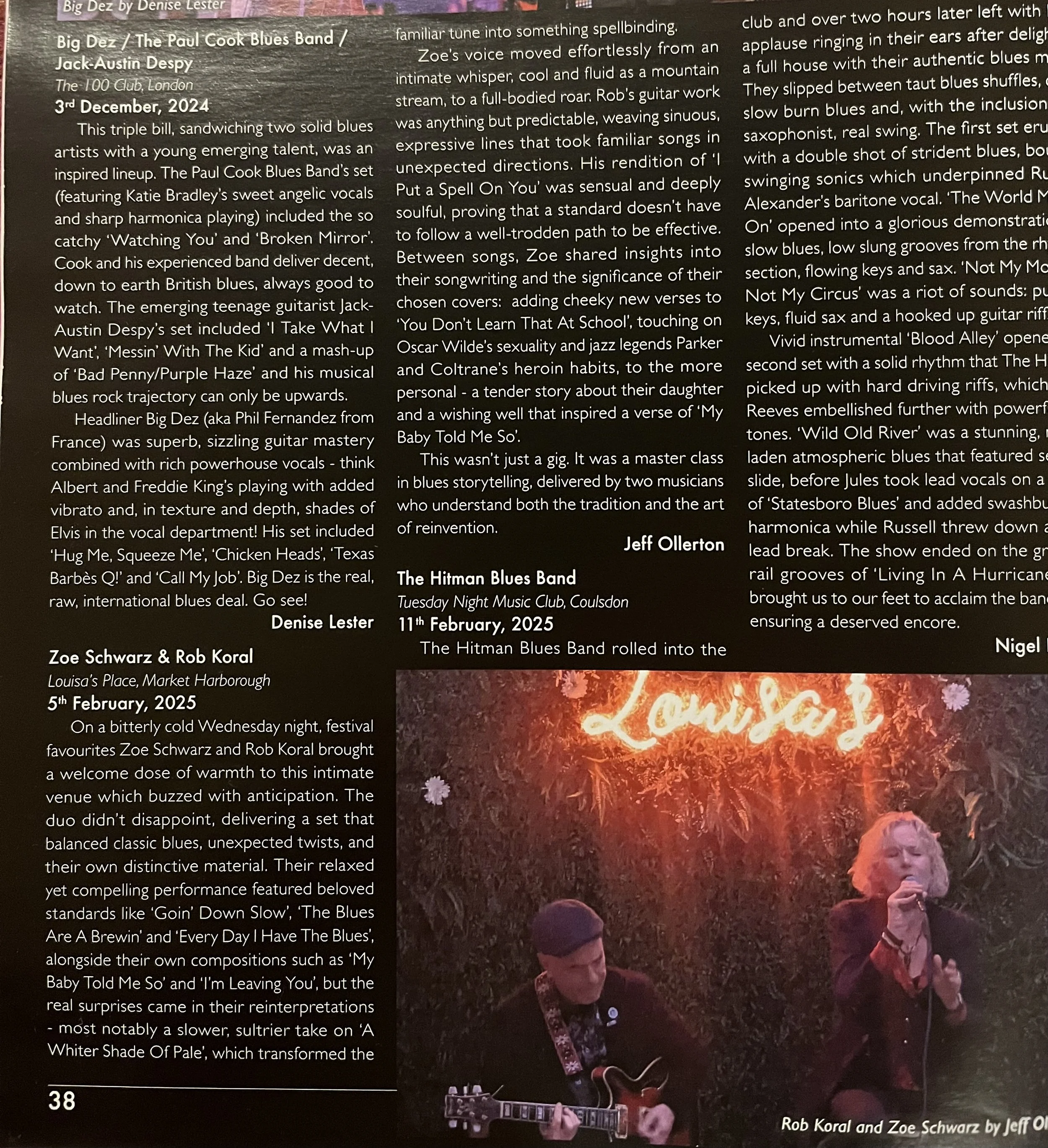 “A masterclass in blues storytelling... a relaxed but compelling performance… Zoe’s voice moved effortlessly from intimate whisper to… full-bodied blues powerhouse.” Jeff Ollerton